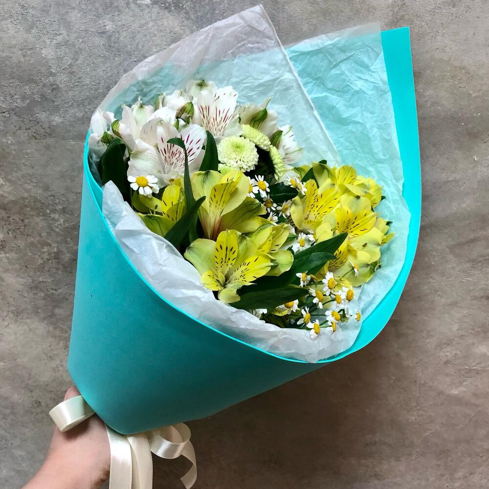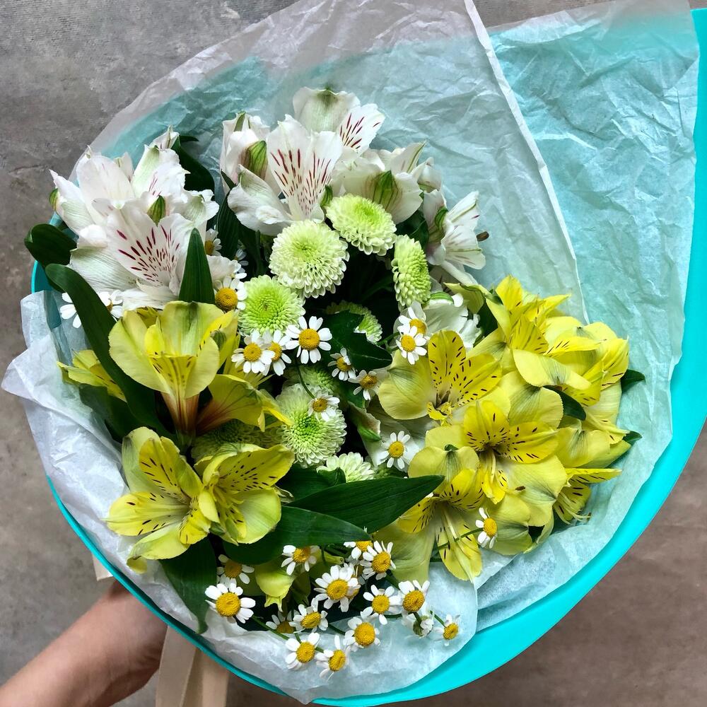 Альстромерия – 5 шт.Матрикария – 2 шт.Сантини – 2 шт.Упаковка дизайнерская – 2 шт.Лента атласная – 2 шт.