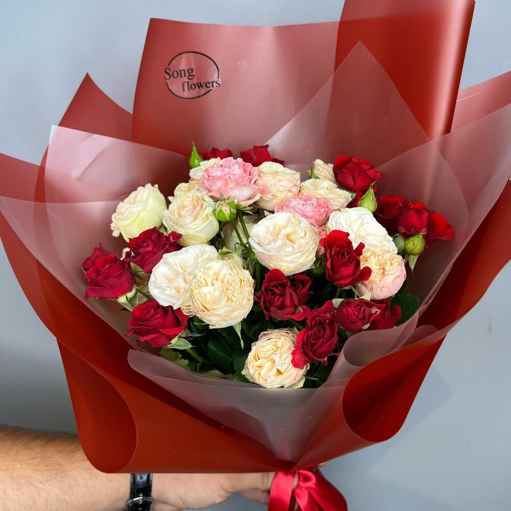 11 кустовых пионовидных роз в дизайнерской упаковке
