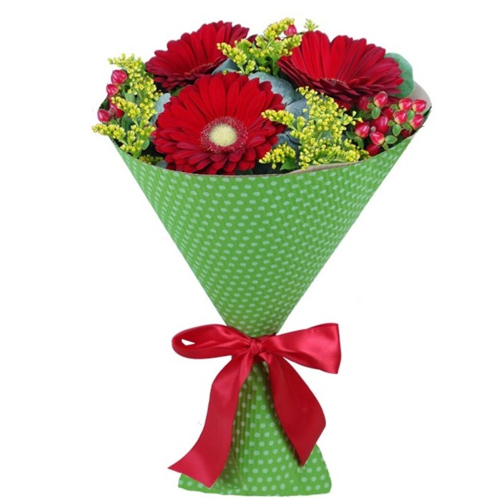Солидаго – 1 шт.лента декоративная – 1 шт.Эвкалипт – 1 шт.Гиперикум красный – 3 шт.Гербера красная – 3 шт.