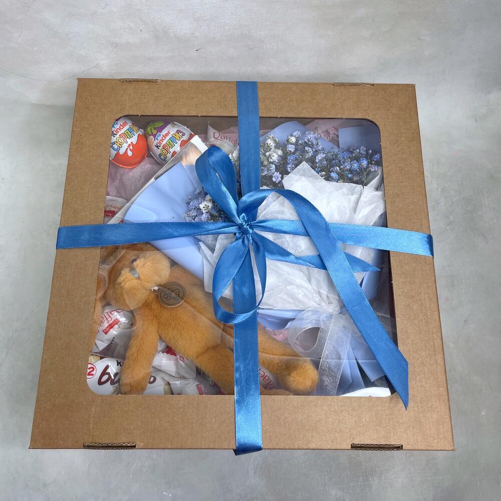 Гипсофила – 3 шт.Упаковка – 1 шт.Kinder bueno – 1 шт.Kinder сюрприз – 2 шт.Kinder chocolate – 1 шт.Raffaello конфеты – 10 шт.коробка крафт с окошком – 1 шт.игрушка зайчонок lapkin – 1 шт.