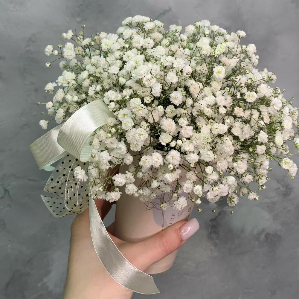 Стаканчик с гипсофилой – отличный вариант презента или дополнения к основному подарку, или просто без повода)Небольшую композицию удобно разместить дома, на работе, так как не требуется ваз)Стаканчик будет долго радовать своей красотой и нежностью и дарить только положительные эмоции
