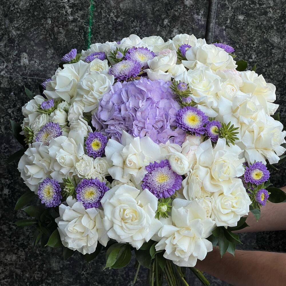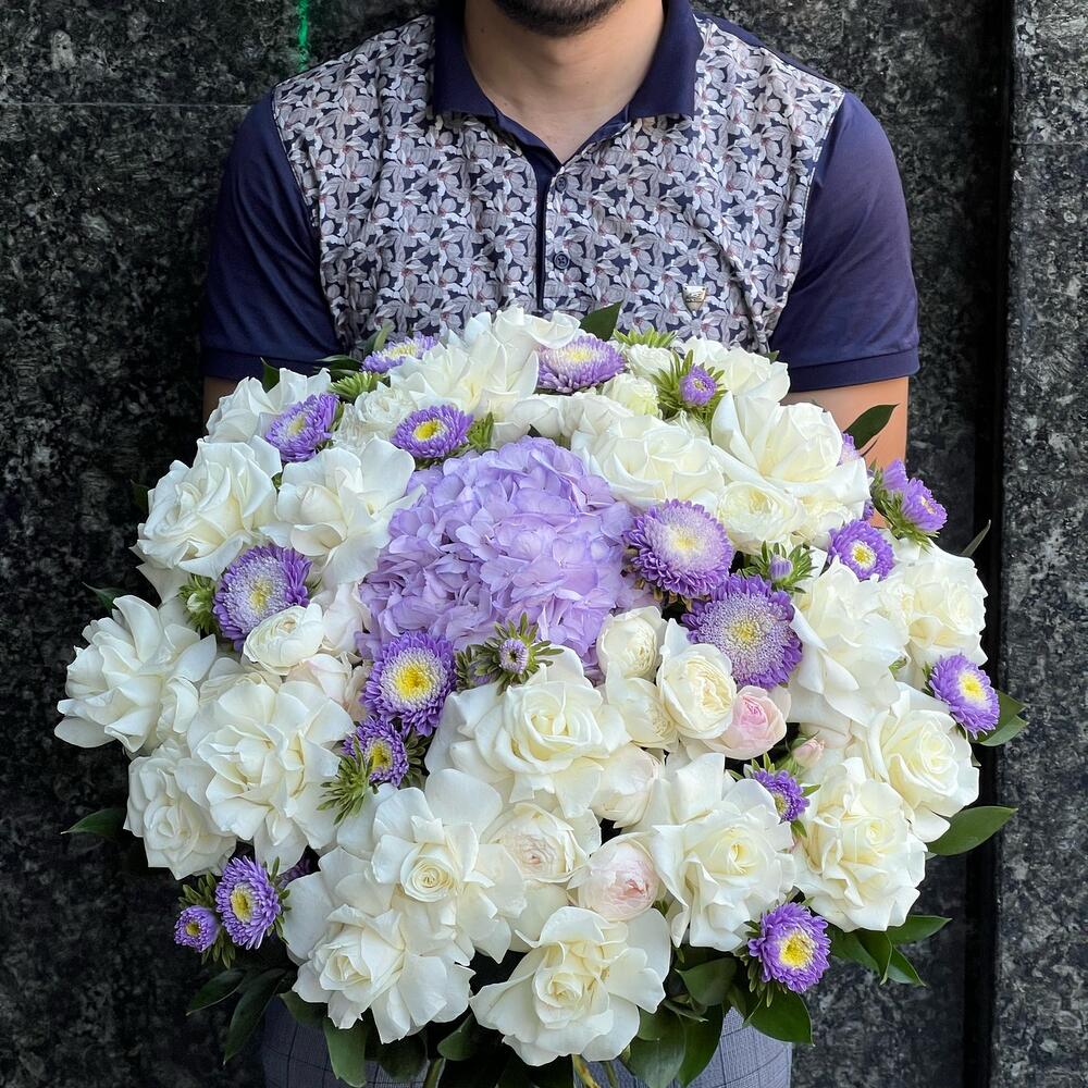 Гортензия сиреневая – 1 шт. Астра кустовая – 9 шт. розы – 21 шт. розы кустовые пионовидные – 7 шт. Рускус – 25 шт. Аспидистра – 6 шт.