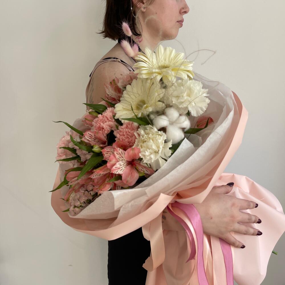 Альстромерия – 5 шт.Статица – 1 шт.Хлопок – 2 шт.Лента атласная – 2 шт.Гербера – 2 шт.Диантус – 7 шт.Фисташка – 2 шт.Упаковка дизайнерская – 4 шт.Лагурус – 5 шт.Стифа – 1 шт.