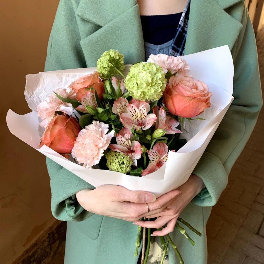 Альстромерия – 2 шт.Вибурнум – 1 шт.Гвоздика розовая – 2 шт.Рускус сочи – 2 шт.Роза кахала – 3 шт.Авторская упаковка – 1 шт.