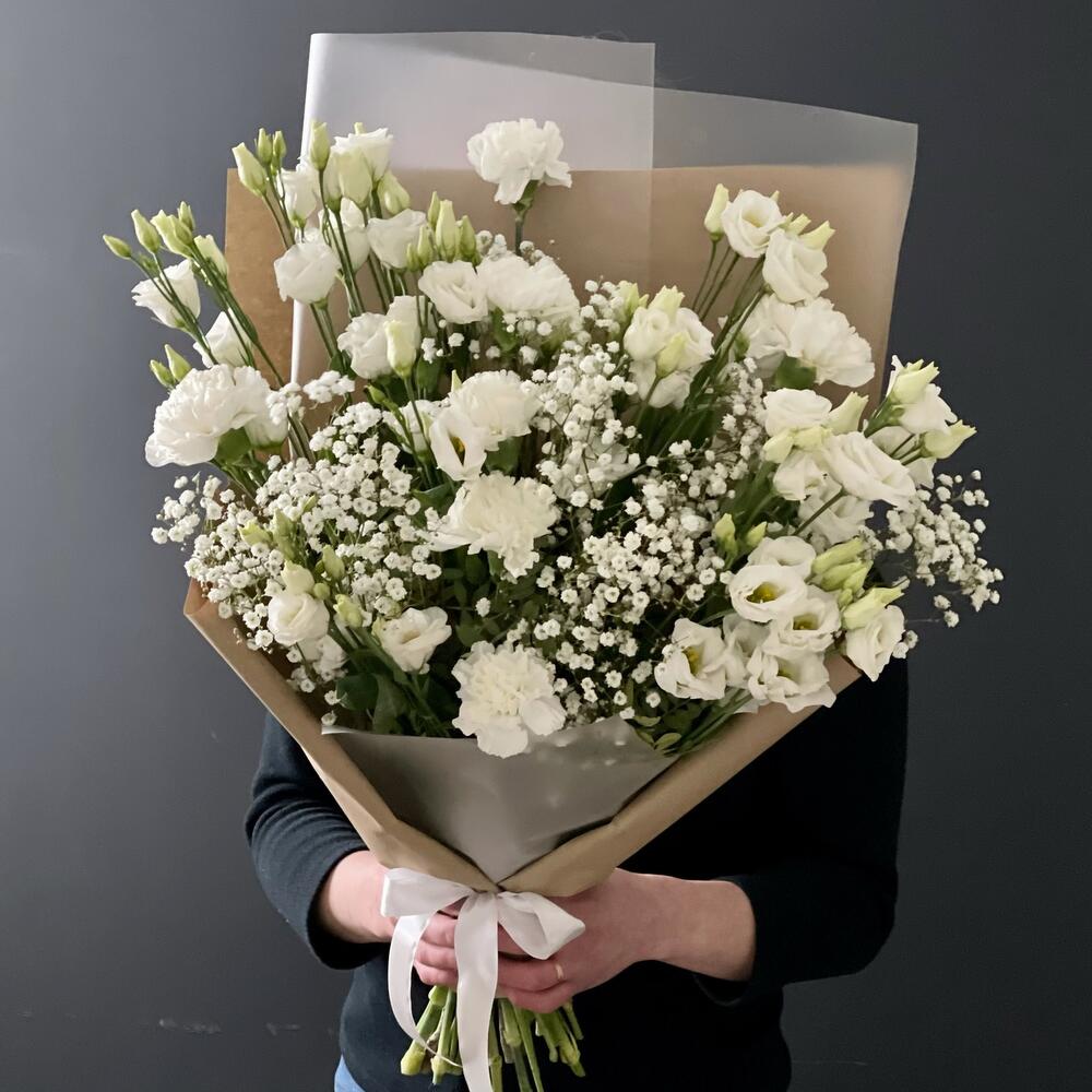 Гипсофила – 3 шт.Диантус – 7 шт.Фисташка – 3 шт.Крафт – 3 шт.эустома белая – 5 шт.