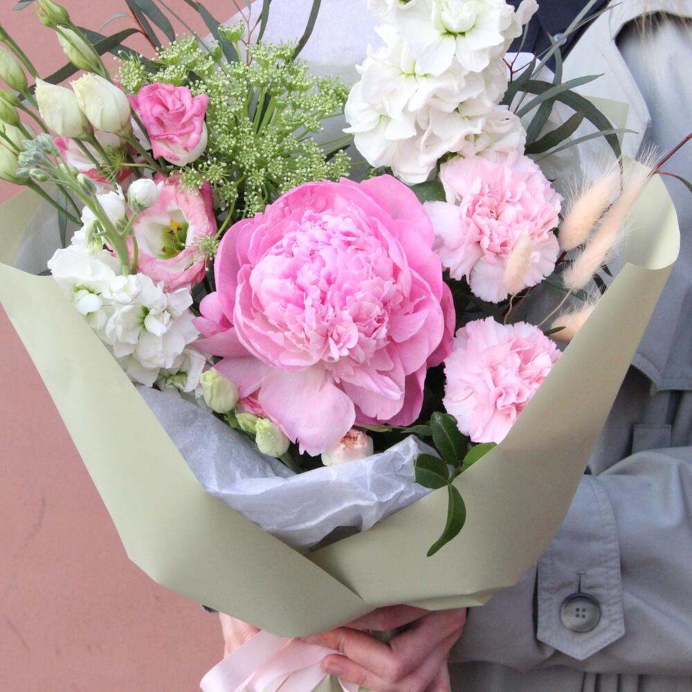 Пион – 1 шт.Лизиантус – 1 шт.Маттиола – 2 шт.Амми – 1 шт.Гвоздика – 1 шт.Лагурус – 5 шт.Эвкалипт – 2 шт.Упаковка дизайнерская – 1 шт.Лента атласная – 1 шт.