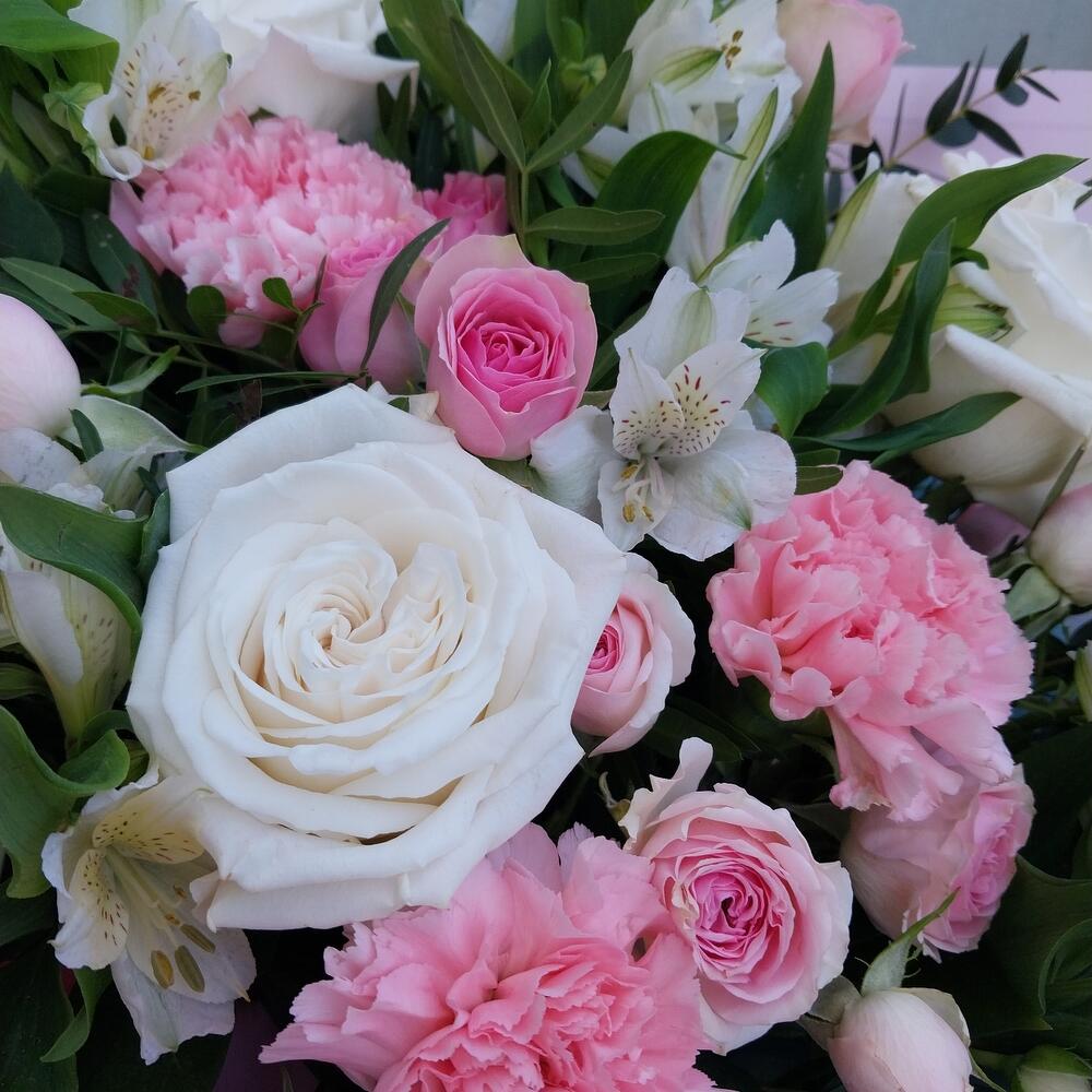 Альстромерия – 5 шт.Эвкалипт – 2 шт.Диантус – 3 шт.Роза кустовая розовая – 4 шт.Упаковка дизайнерская – 3 шт.фисташка зелень – 10 шт.роза пионовидная охара белая – 3 шт.
