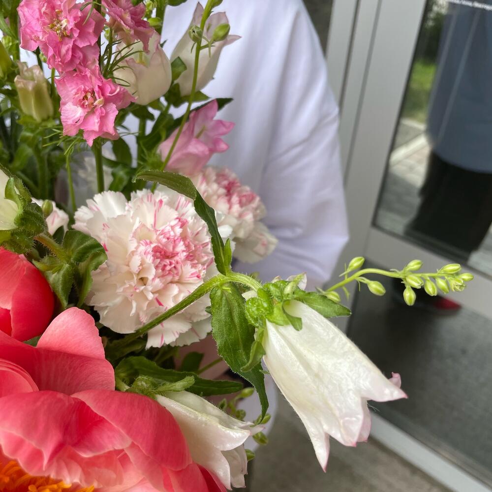 Дельфиниум – 5 шт.Кампанула – 5 шт.Пион Коралл Шарм (Coral Charm) – 7 шт.Диантус – 7 шт.Коробка шляпная – 1 шт.Оазис – 1 шт.василек – 3 шт.Лента бархат – 1 шт.сезонная зелень – 2 шт.