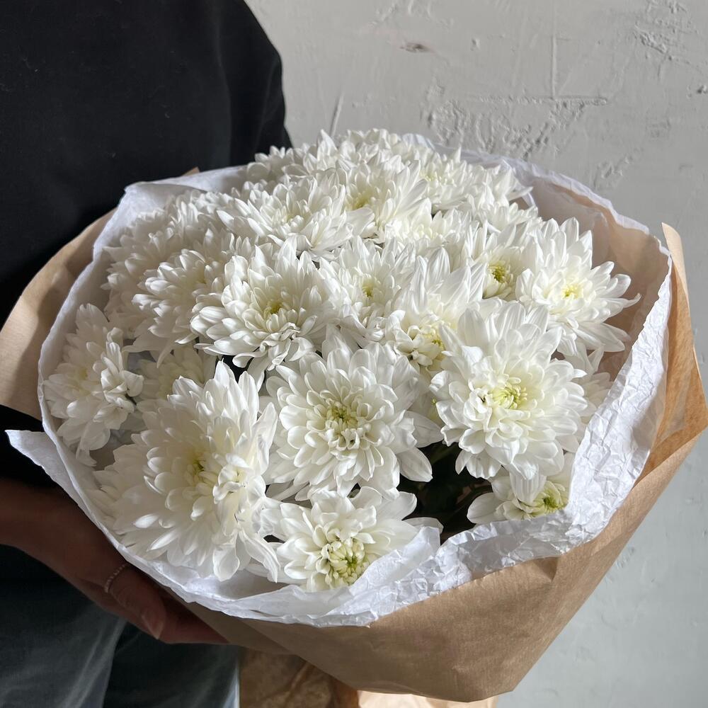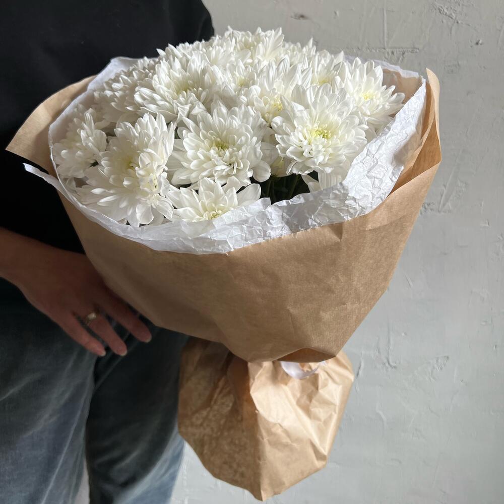 Лента атласная – 2 шт.Хризантема кустовая белая – 7 шт.Упаковка дизайнерская – 3 шт.