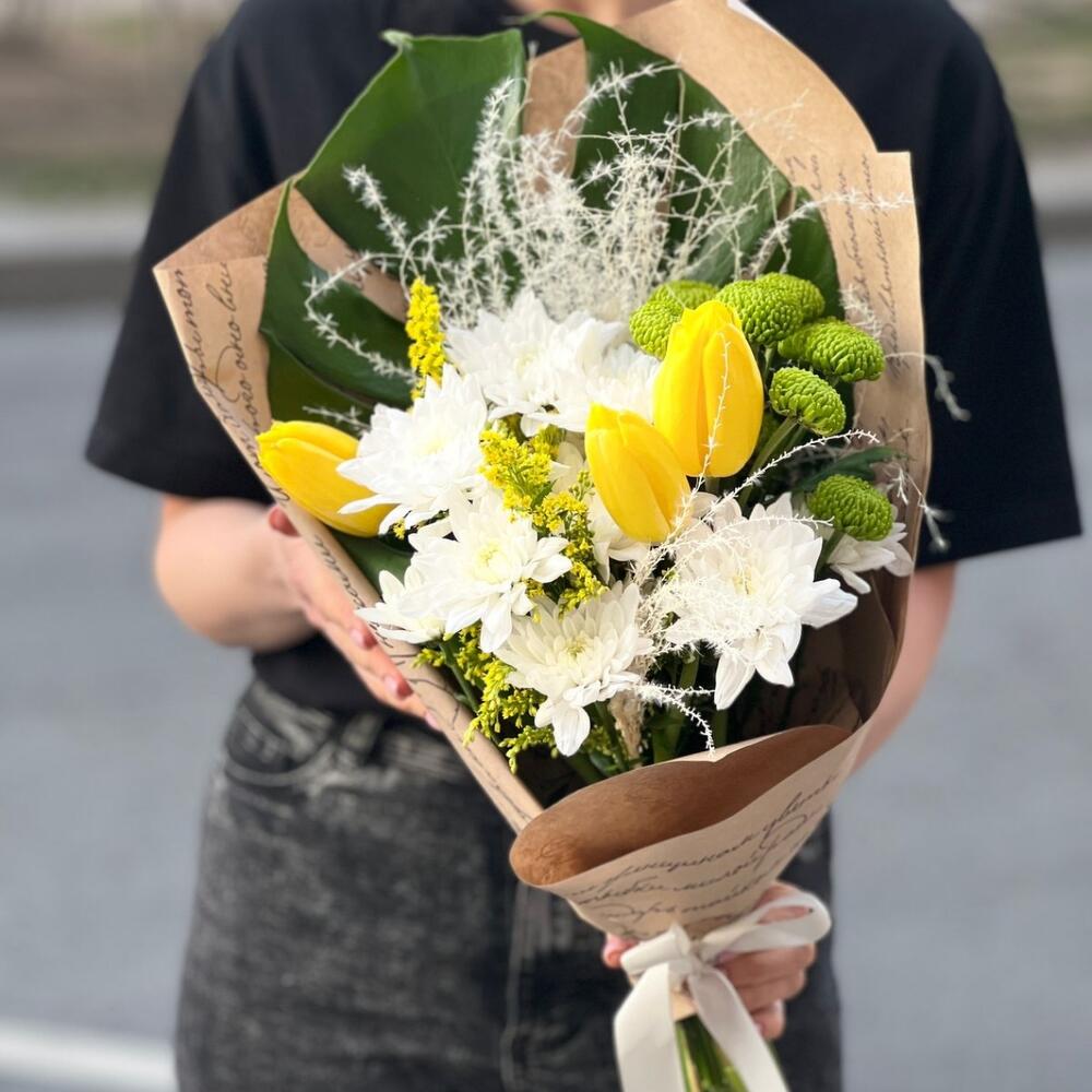 Монстера – 1 шт.Солидаго – 2 шт.Тюльпан – 3 шт.Лента атласная – 1 шт.Хризантема зеленая – 1 шт.Упаковка дизайнерская – 1 шт.хризантема куст белая – 2 шт.пампас белый – 2 шт.