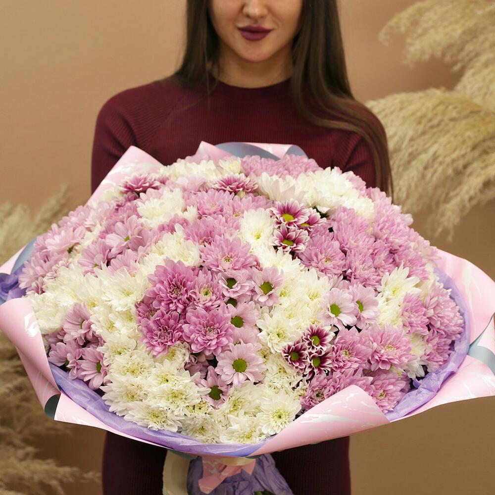 Букет из 51 кустовой хризантемы нежный микс в стильной упаковке