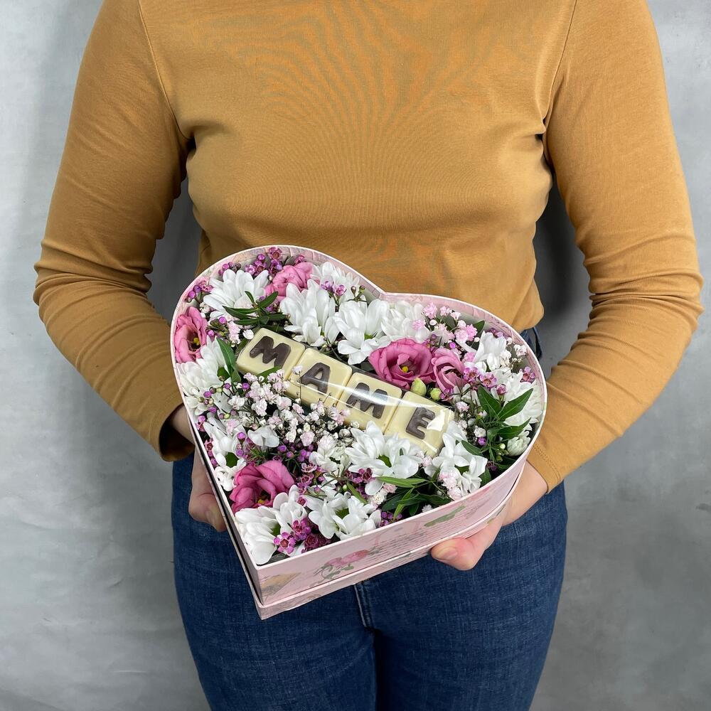 Коробка сердце – 1 шт.Оазис – 1 шт.Буква шоколадная – 4 шт.Хризантема кустовая – 2 шт.Лизиантус – 2 шт.Ваксфлауэр – 1 шт.Гипсофила – 1 шт.Фисташка – 1 шт.