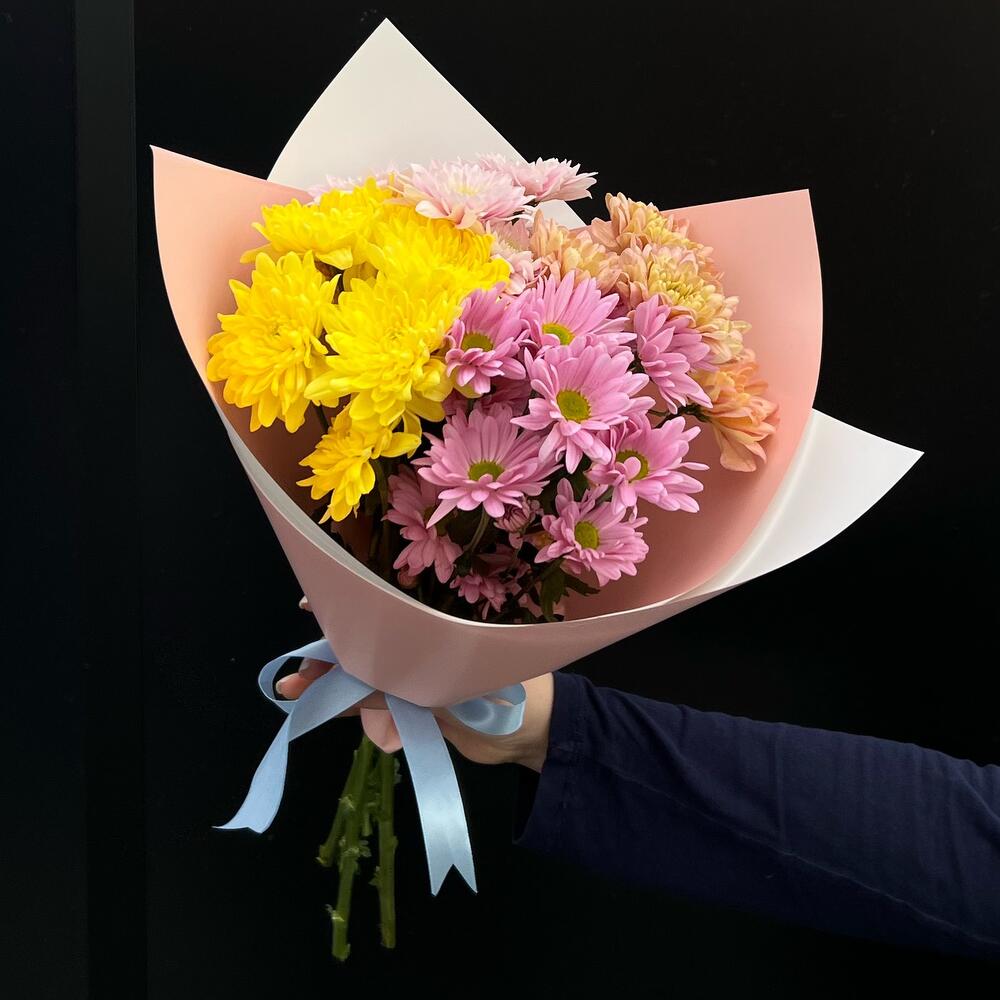 Хризантема голландия – 5 шт. Открыточка с вашими пожеланиями – 1 шт. Дизайнерская упаковка – 2 шт. инструкция по уходу за цветами – 1 шт.