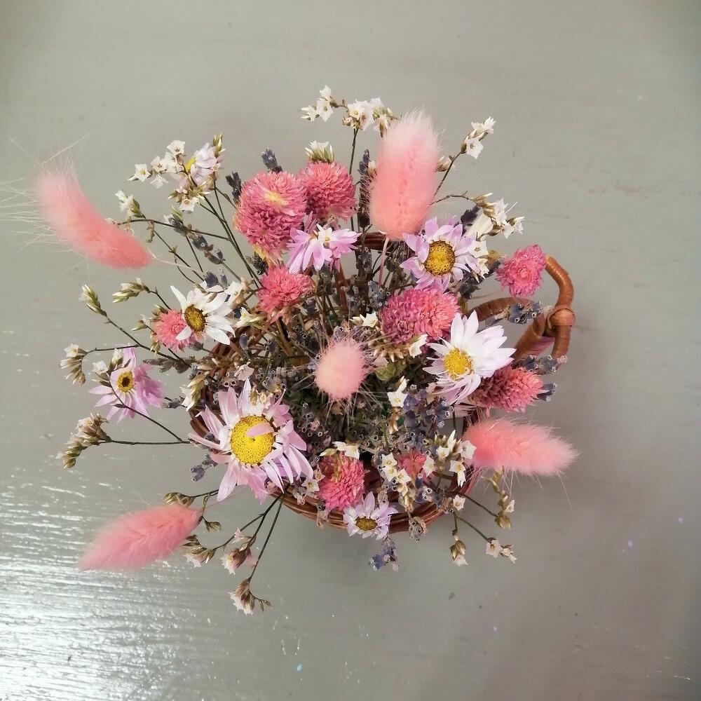Лаванда (сухоцвет) – 20 шт.гелихризум (сухоцвет) – 10 шт.Лагурус (сухоцвет) – 5 шт.Лимониум – 1 шт.Оазис флористический – 1 шт.велосипед декоративный – 1 шт.