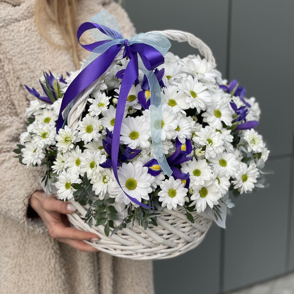 Корзина – 1 шт. Писташ – 6 шт. Хризантема – 11 шт. Оазис – 2 шт. Оформление – 1 шт. ирисы – 9 шт.