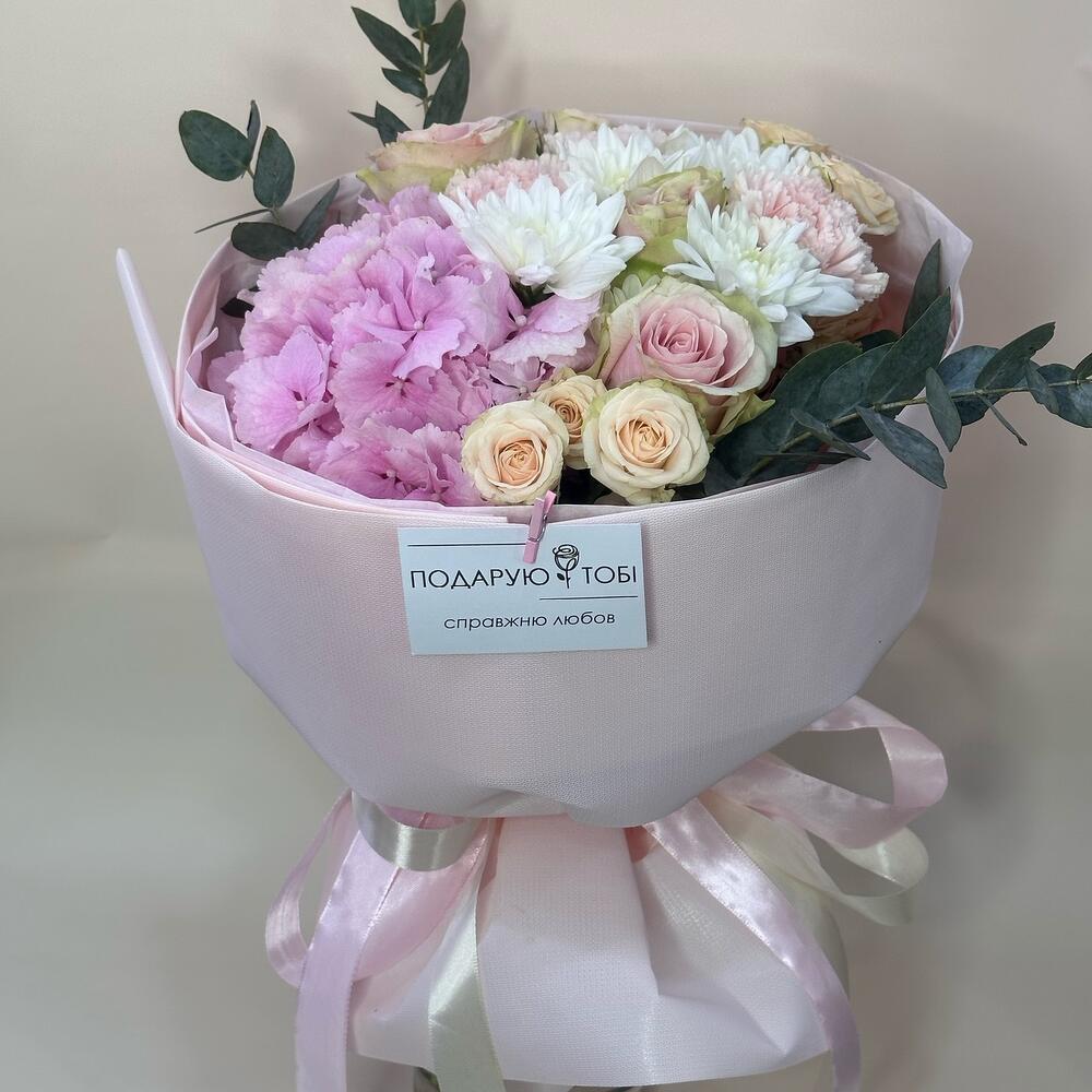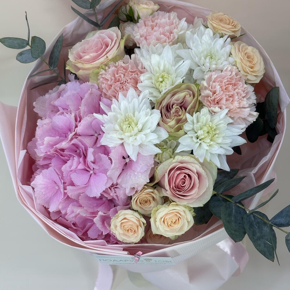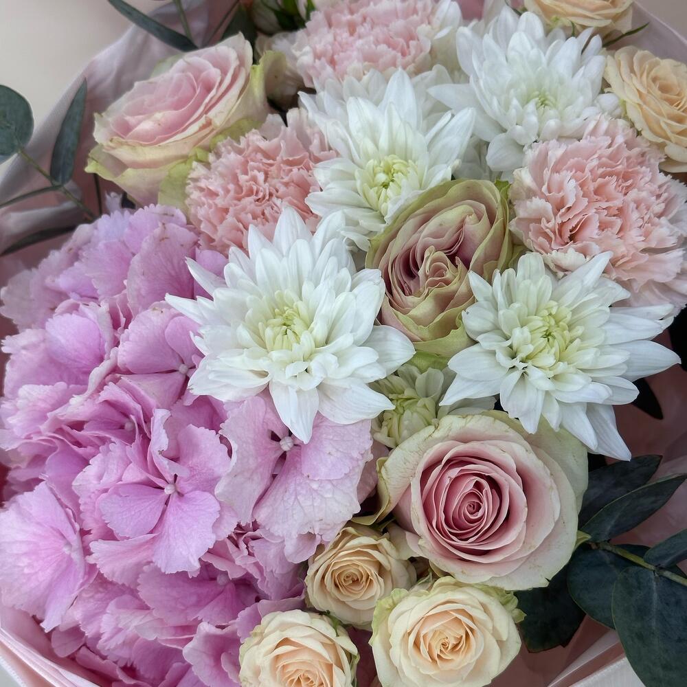 Альстромерии, Гортензии, Кустовые розы, Лизиантусы, Розы, Хризантемы