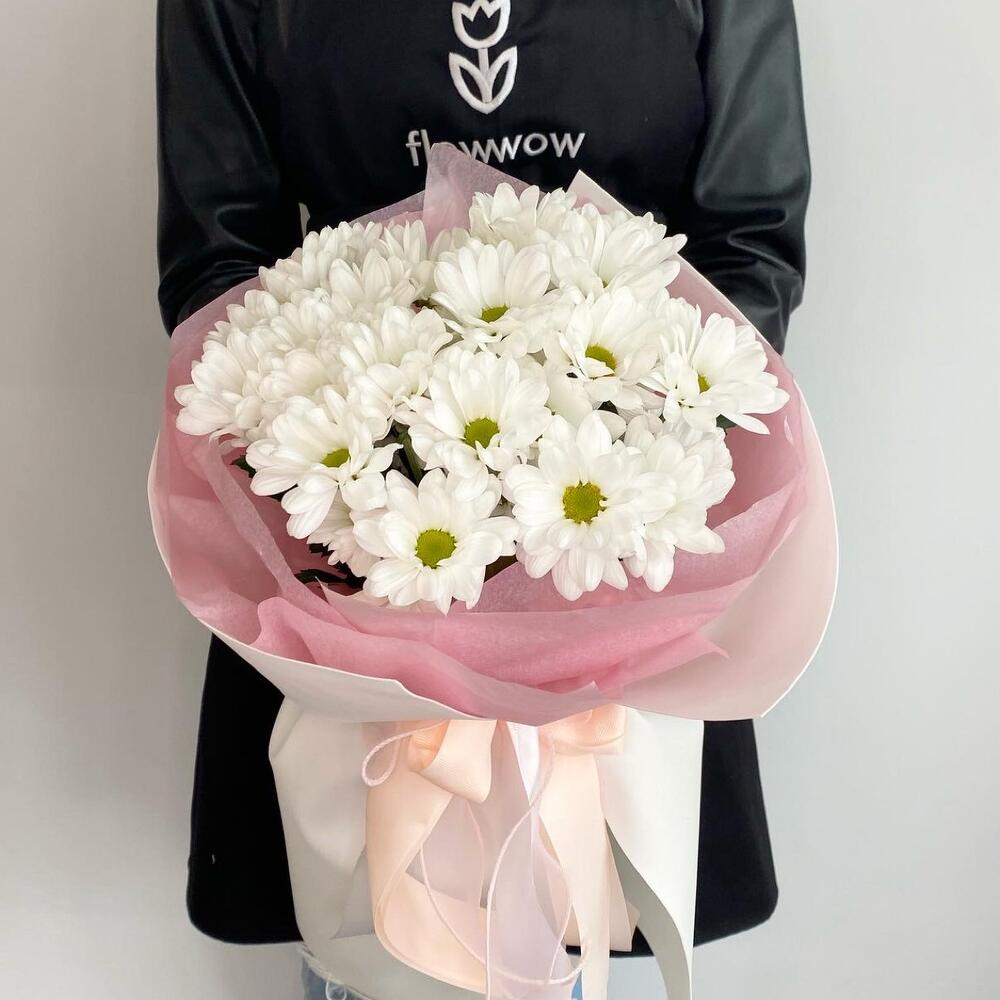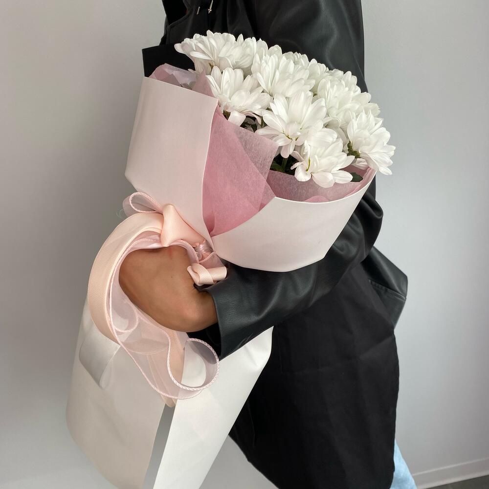 Букет из ромашковых хризантем в стильном дизайнерском оформлении.Уважаемые покупатели! Пожалуйста обратите ваше внимание на размер букета при заказе! Он учитывается вместе с упаковкой Чтобы наши прекрасные букеты дольше радовали получателя рекомендуем вам:⭐Обновить срез букета перед тем, как поставить его в воду⭐Ставить цветы в прохладную проточную воду ⭐Меняйте воду в вазу каждый день⭐Не забывайте подрезать цветы, перед тем, как ставить их в воду⭐Не ставить у отопительных приборов и на сквозняке Фирменный стиль наших букетов разработан специально так, чтобы упаковку не нужно было снимать, так как она придаёт целостность букету и прекрасно держится в вазе