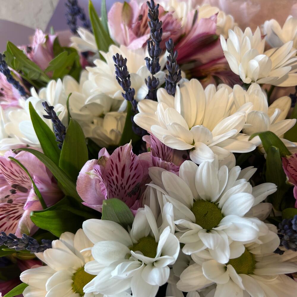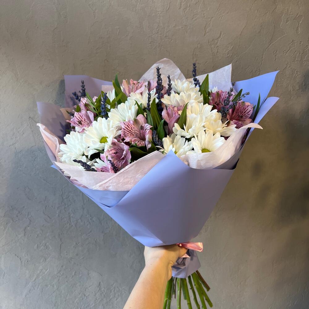 Хризантема кустовая – 6 шт.Альстромерия – 5 шт.лаванда стабилизированная – 15 шт.Фисташка – 2 шт.Упаковка дизайнерская – 1 шт.