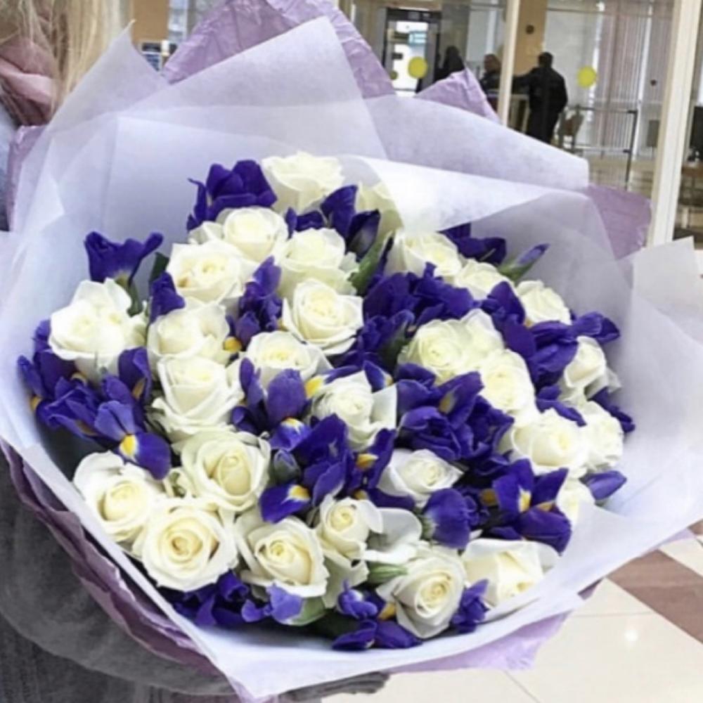 ирисы синие – 25 шт.розы белые – 31 шт.Дизайнерская упаковка – 1 шт.
