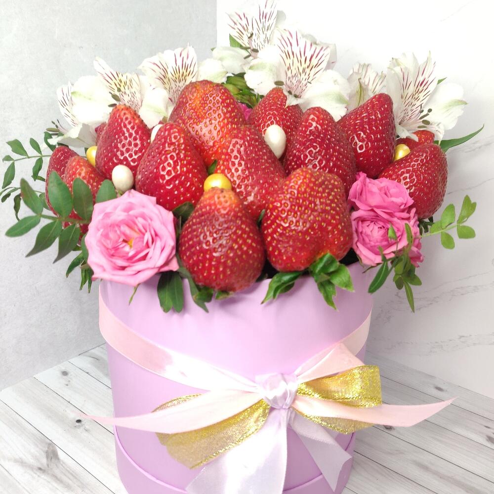Альстромерия – 4 шт.Клубника – 800 гр.Кустовая роза – 5 шт.Шляпная коробка – 1 шт.Фисташка пучок – 3 шт.
