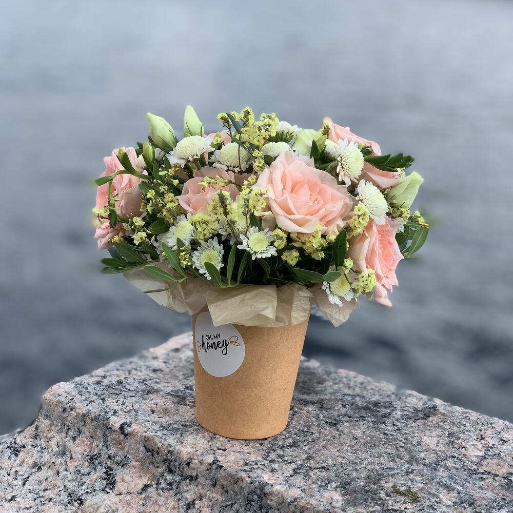 стакан крафт – 1 шт.Губка флористическая – 1 шт.Роза кустовая – 1 шт.Фисташка – 1 шт.Лимониум – 1 шт.Сталион – 1 шт.Альстромерия – 1 шт.Тишью – 1 шт.
