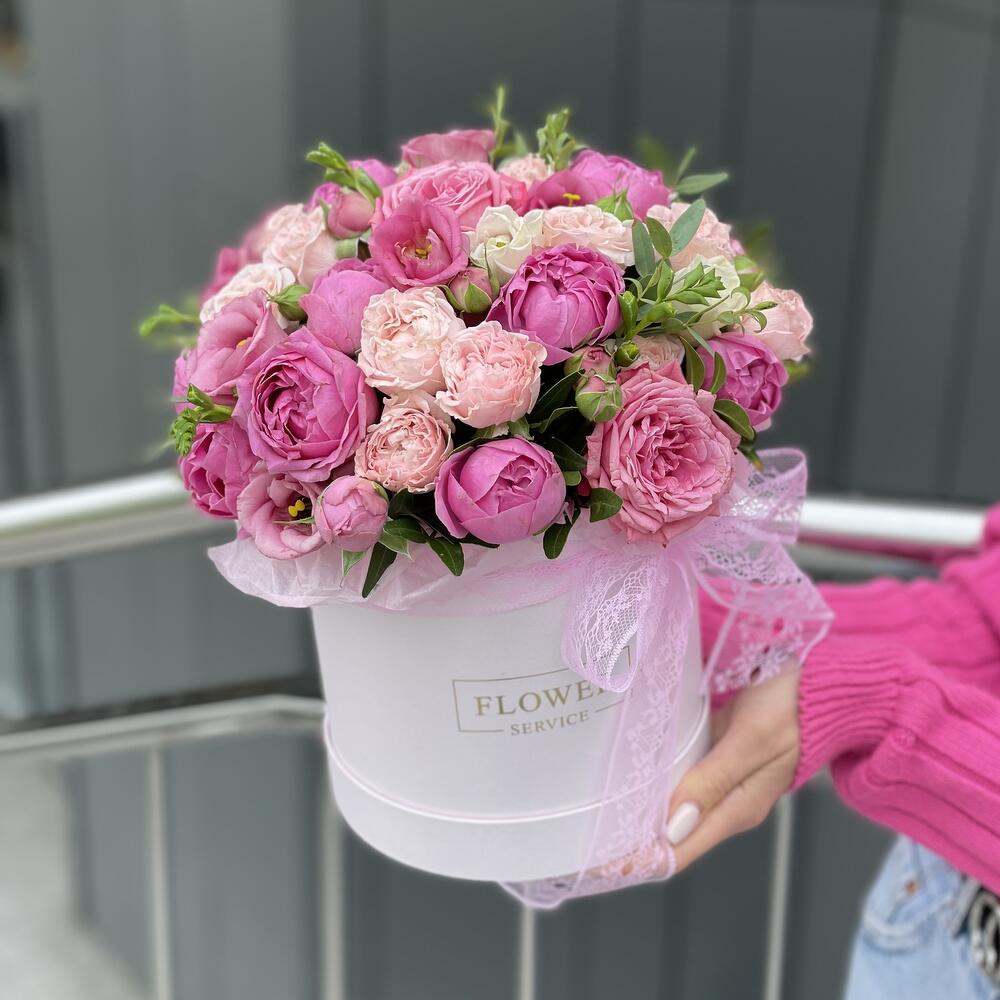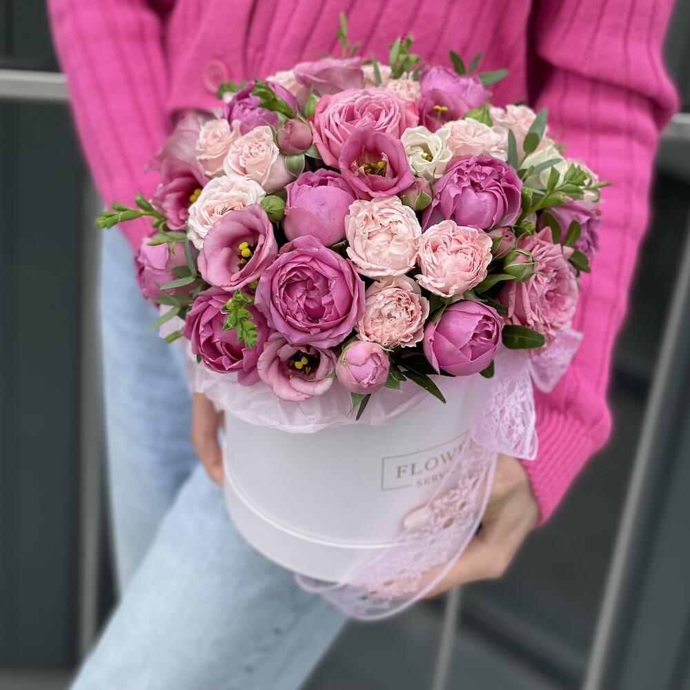 Коробка Трогательные чувства из эустомы и пионовидных роз