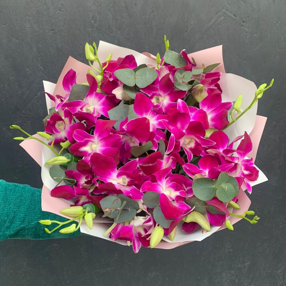Дендробиум – 51 шт.удлинитель для орхидеи – 25 шт.Фисташка – 15 шт.Эвкалипт – 9 шт.Упаковка дизайнерская – 2 шт.Лента атласная – 1 шт.
