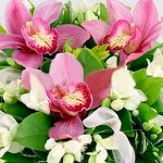 Нежная, трогательная композиция из орхидей цимбидиум и белоснежных фрезий в корзинке. Ансамбль дополнен зеленью и декоративными элементами из лент и бусин. Для самых очаровательных принцесс! Аромат фрезий настолько притягателен, что получательниц не захочет выпускать такую корзинку из рук 🙂 Подарите кучу позитивных эмоций дорогому человеку!