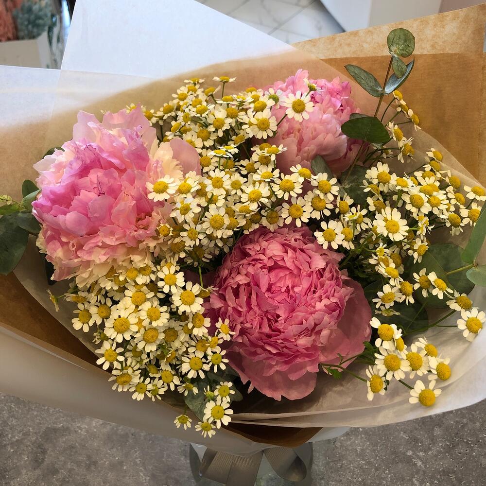 Пион – 3 шт.Матрикария (Ромашка Камила) – 5 шт.Эвкалипт – 1 шт.упаковка подарочная с лентой – 1 шт.Средство для продления жизни цветов – 1 шт.
