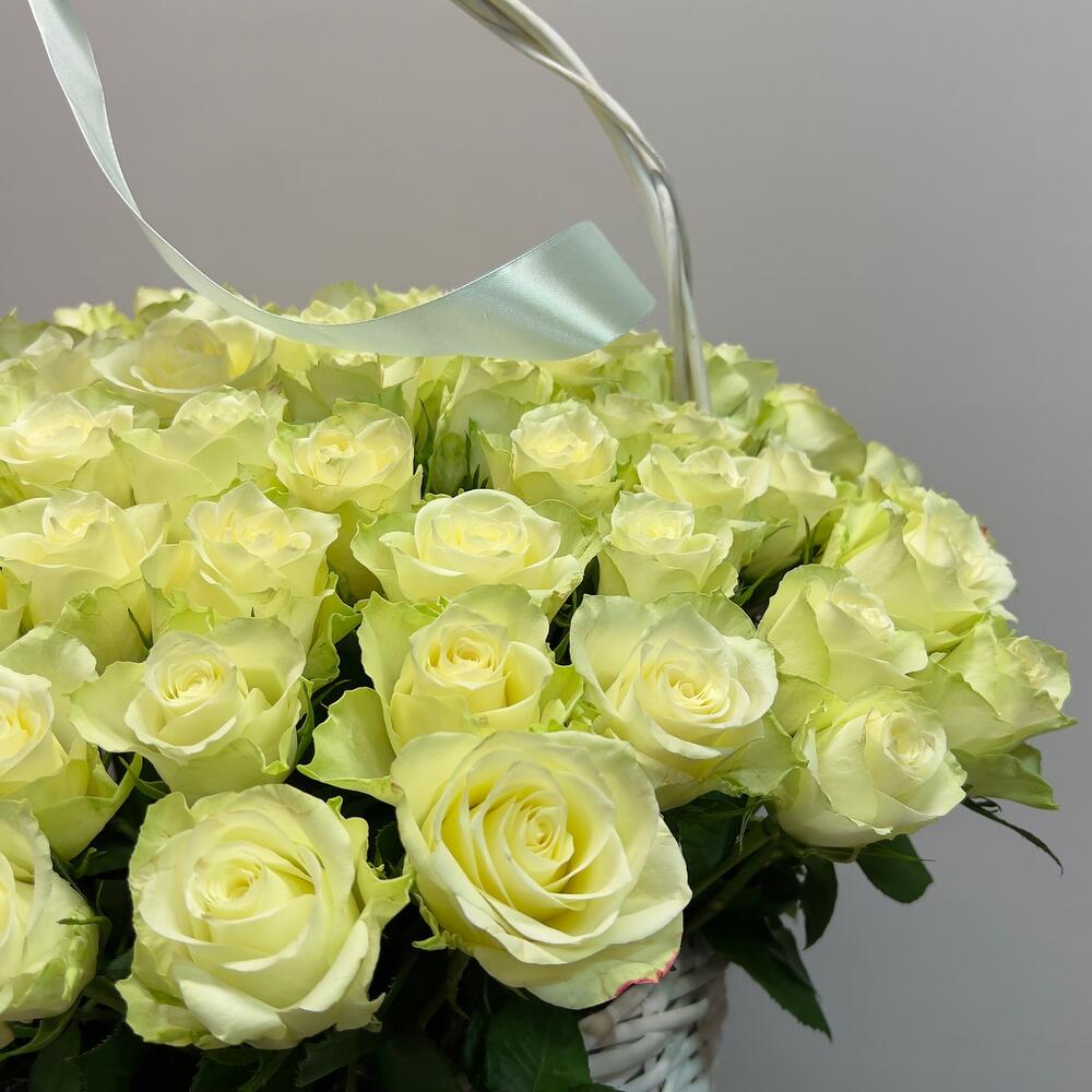101 белая роза в корзине