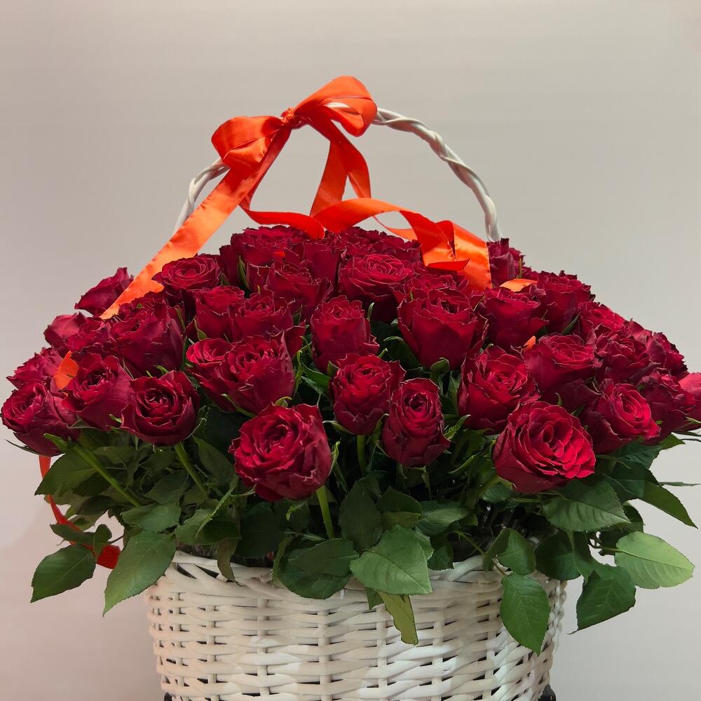 Метки: 101 роза, от 5000 руб, цветы в корзине