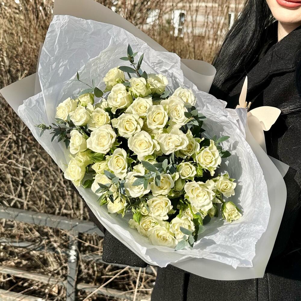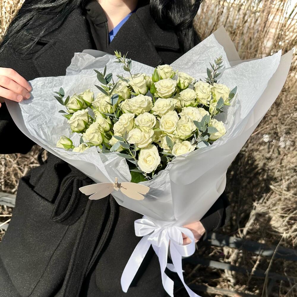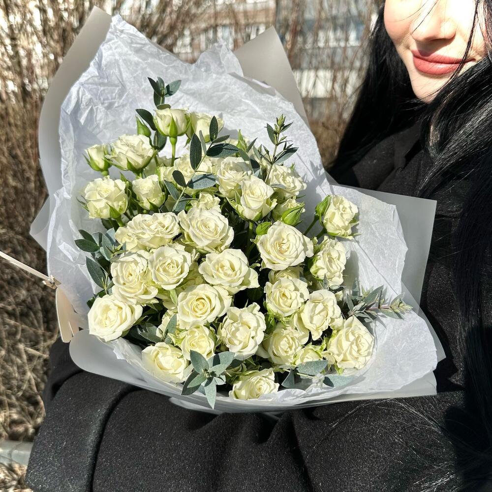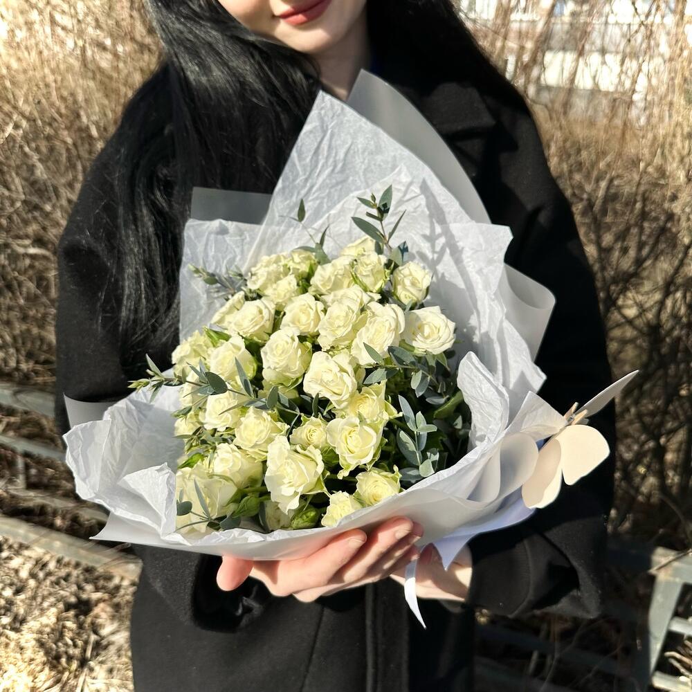Роза кустовая – 11 шт.Эвкалипт – 3 шт.Лента атласная – 1 шт.Тишью – 2 шт.Пленка матовая – 2 шт.Открыточка с вашими пожеланиями – 1 шт.