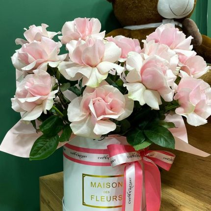 Роза – 15 шт. Лента атласная – 1 шт. Оазис – 2 шт. коробка "m" – 1 шт.