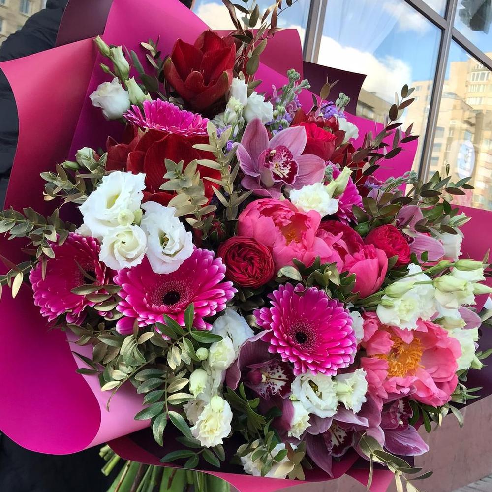 Пион Коралл Шарм (Coral Charm) – 5 шт.Орхидея Цимбидиум – 9 шт.Лизиантус – 10 шт.Маттиола – 7 шт.Гербера – 7 шт.Амариллис – 3 шт.Роза кустовая – 5 шт.Фисташка – 5 шт.Эвкалипт – 5 шт.Итальянский рускус – 1 шт.Упаковка дизайнерская – 5 шт.