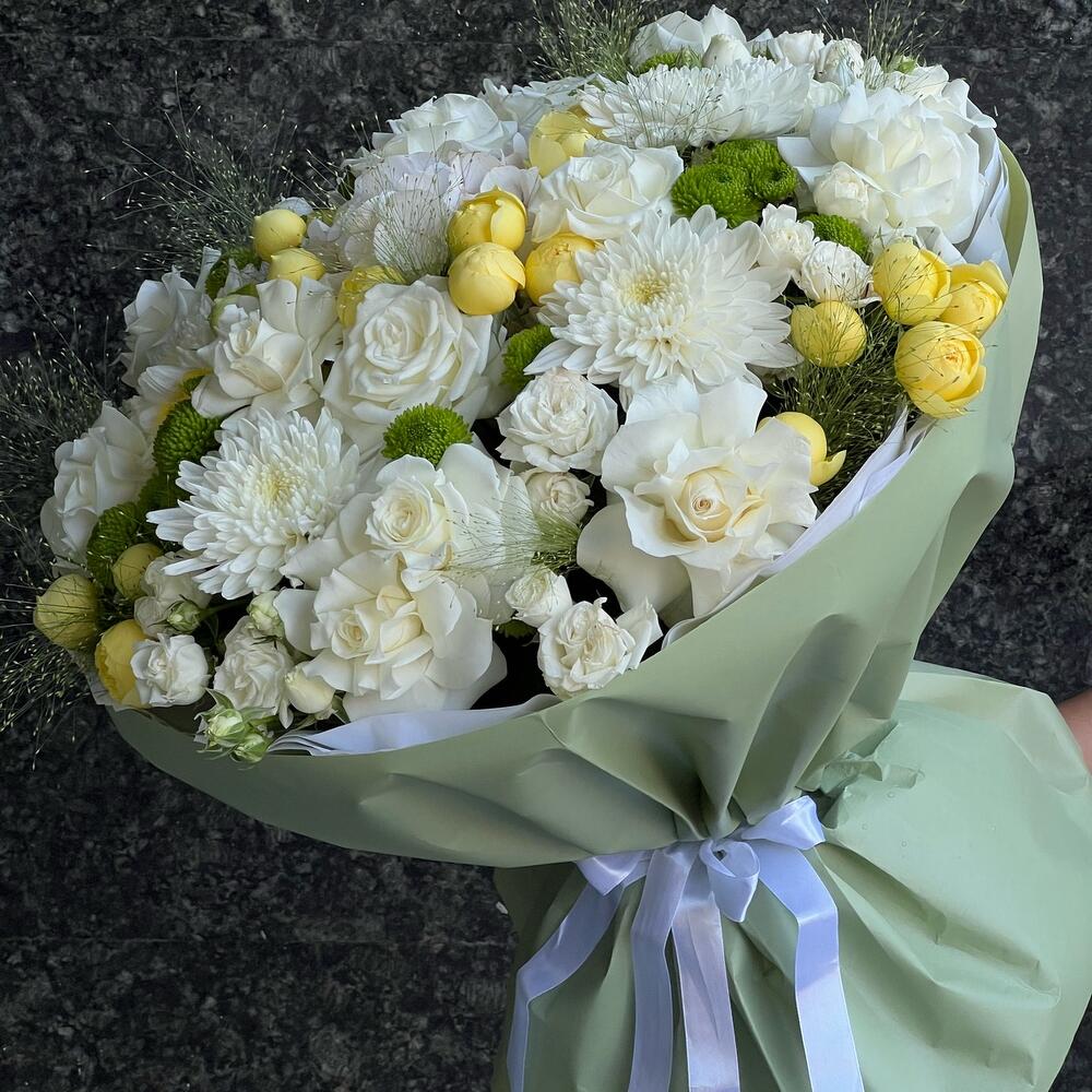 Гортензия – 1 шт. Роза – 13 шт. Спрей роза – 11 шт. Хризантема – 10 шт. Рускус – 5 шт. бумага дизайнерская – 1 шт.