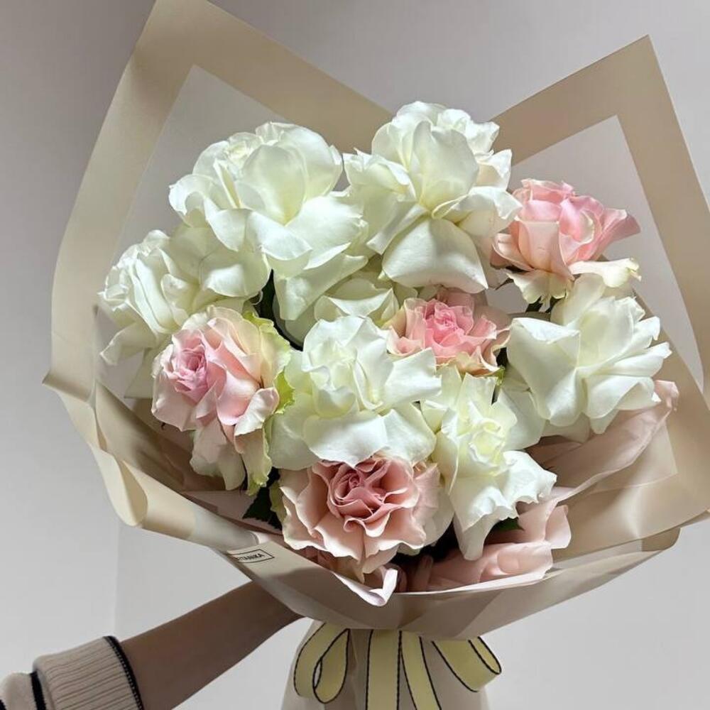 Букет упакован в корейскую пленку и перевязан атласной лентой.