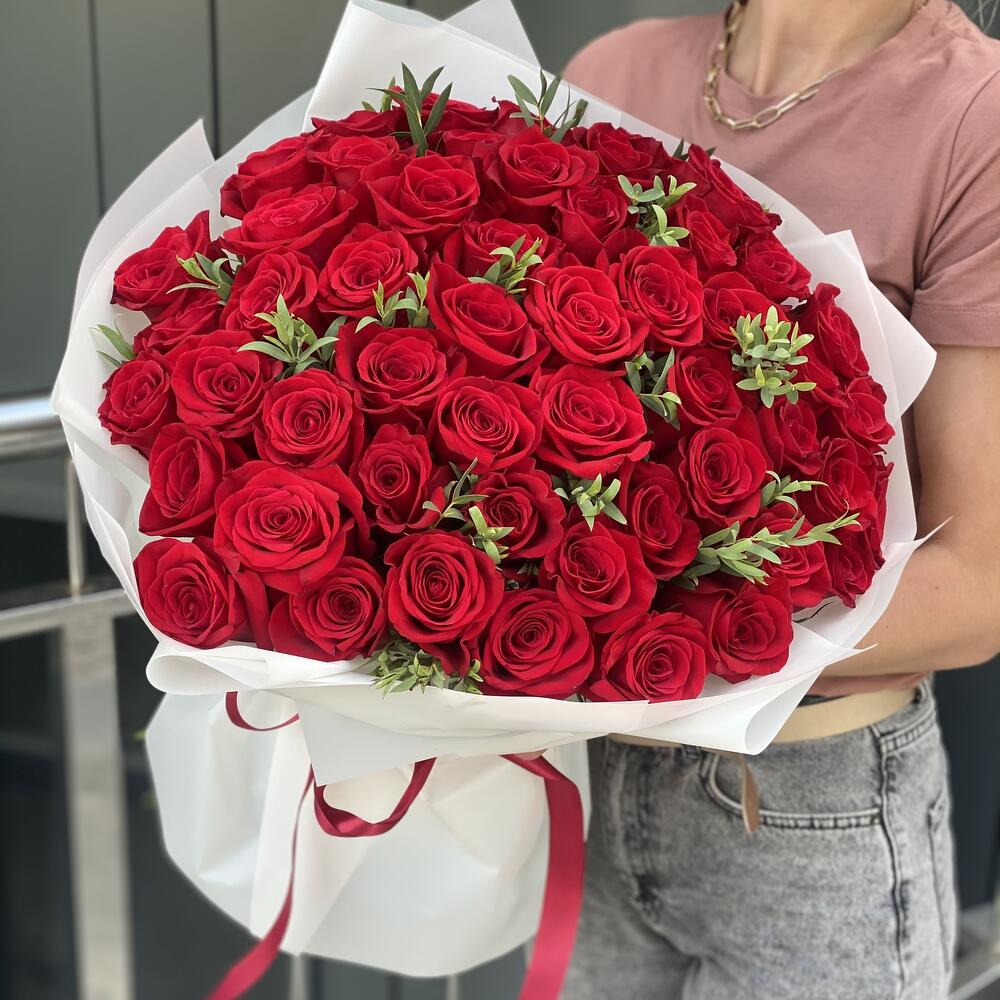 Букет из 51 красной розы и эвкалипта