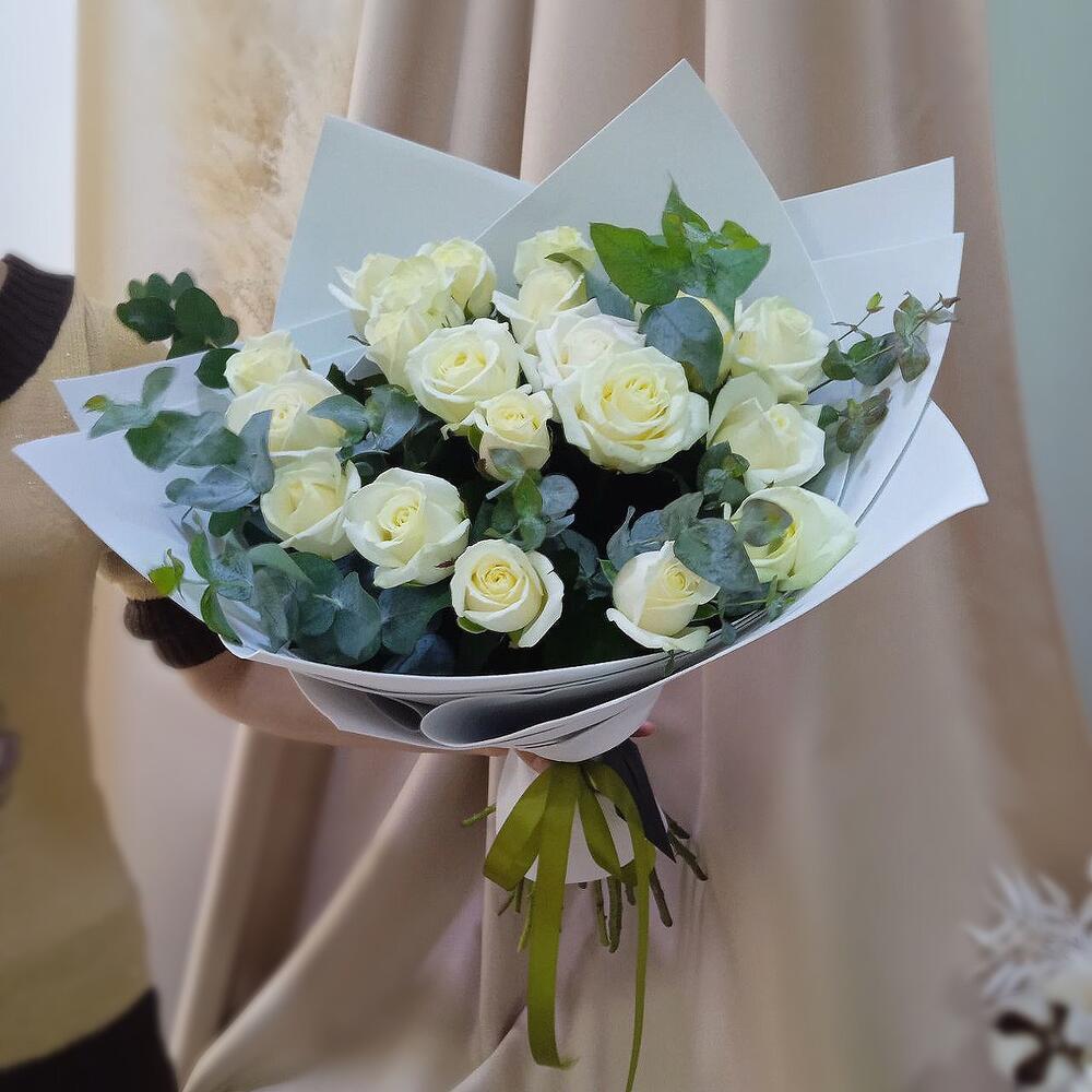 Букет из белых роз и эвкалипта
