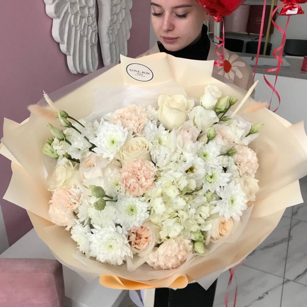 Букет «Облачный» с крупной хризантемой, розами и лизиантусом