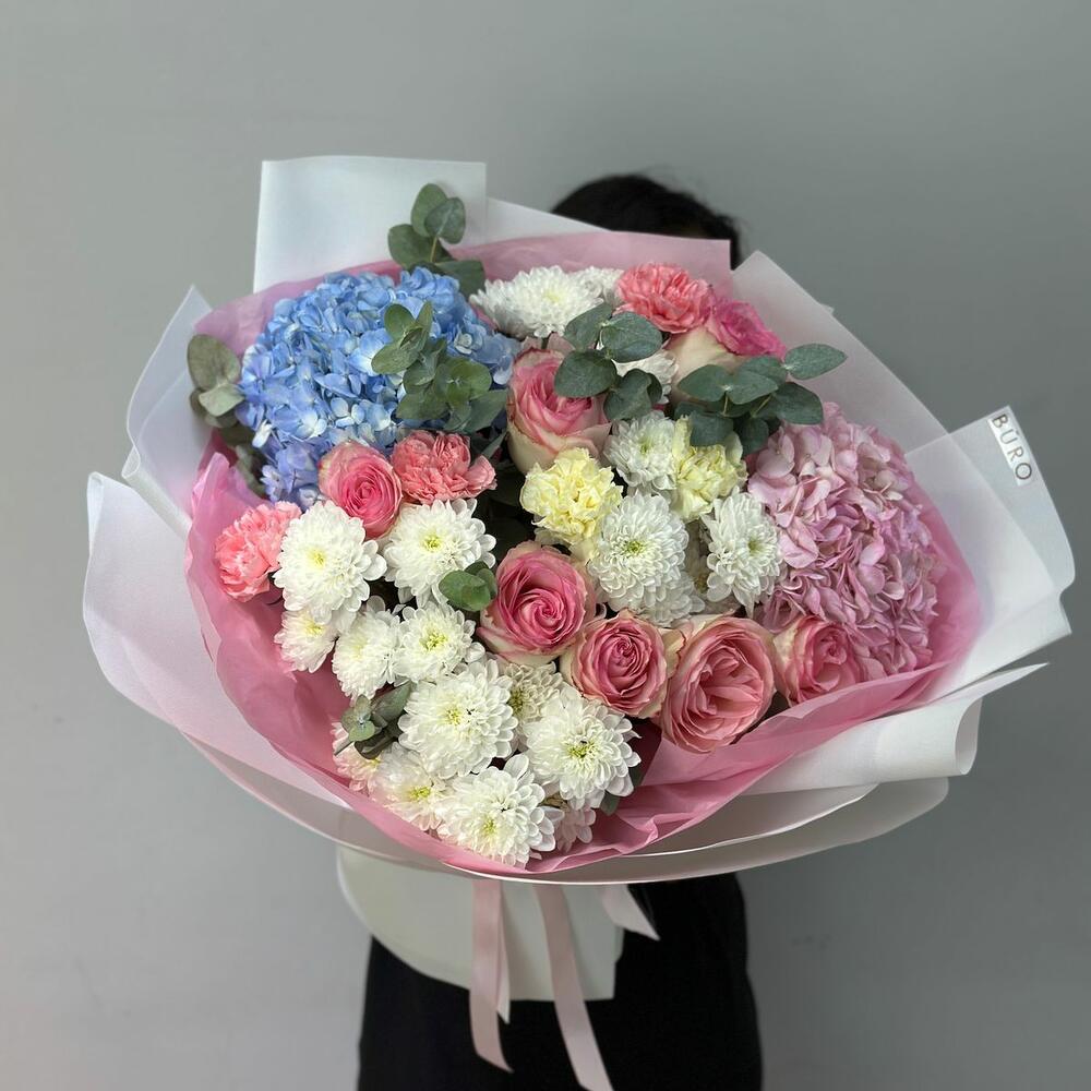 Альстромерии, Гортензии, Кустовые розы, Лизиантусы, Розы, Хризантемы