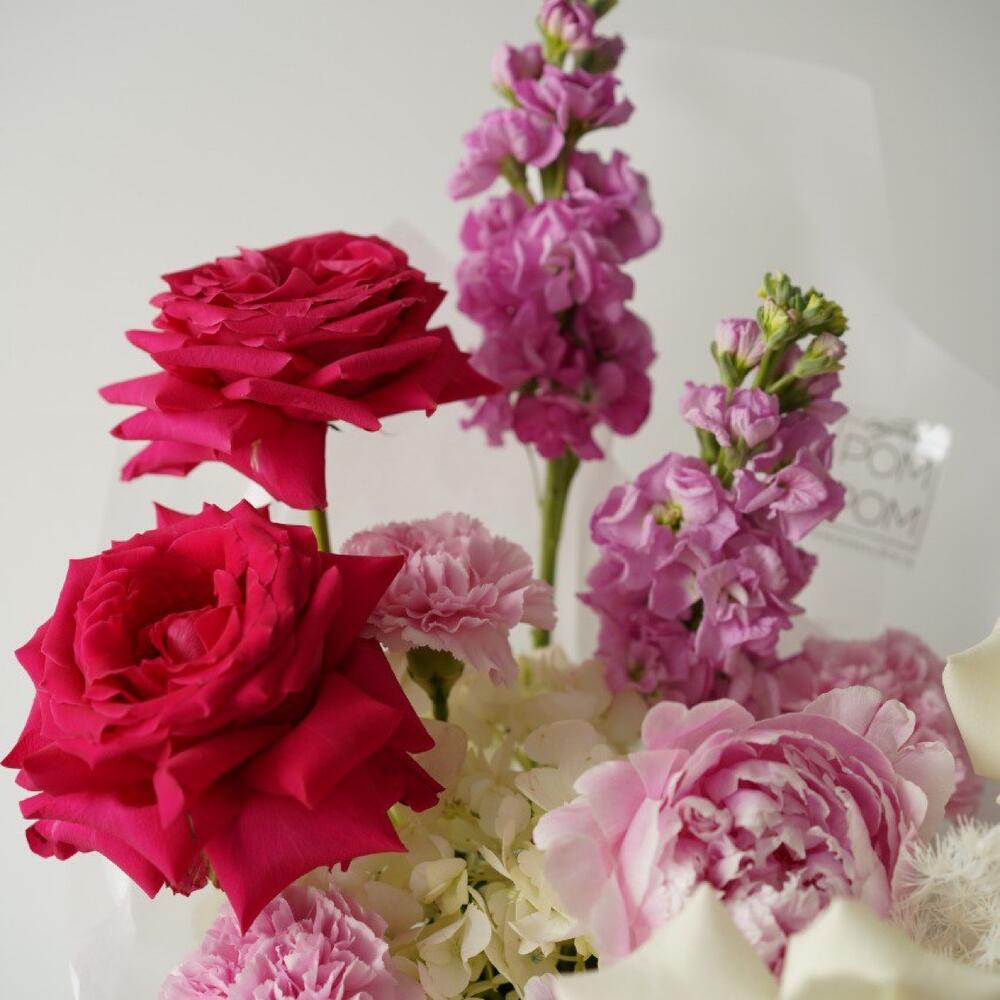 Гортензия – 1 шт.Пион – 2 шт.Маттиола – 2 шт.Роза – 5 шт.Аспарагус – 1 шт.Упаковка дизайнерская – 1 шт.