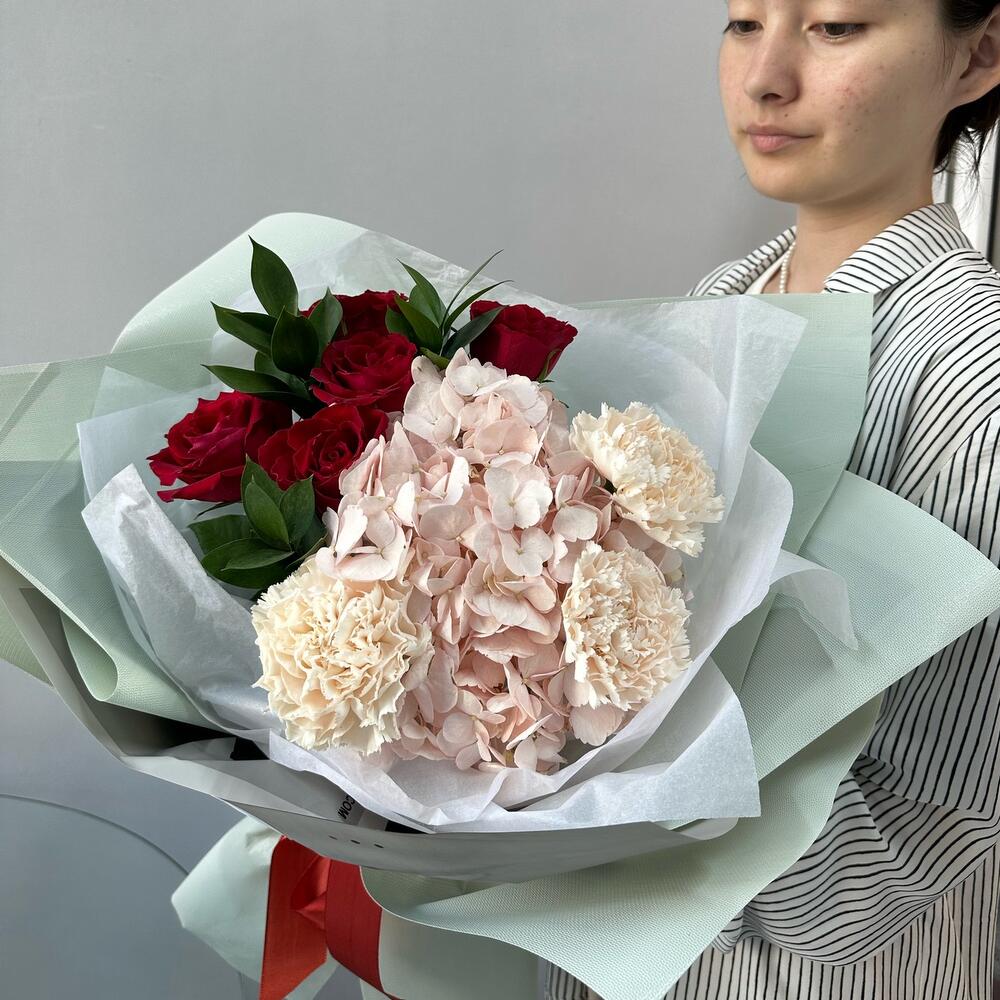 Гвоздики, Пионовидные розы, Розы