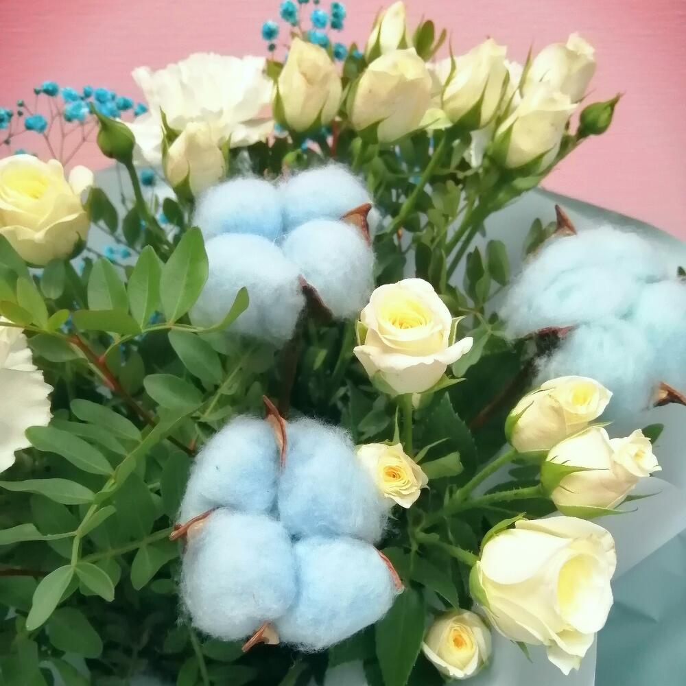 Гипсофила – 1 шт.Роза кустовая – 3 шт.Упаковка – 2 шт.Диантус – 3 шт.Фисташка – 3 шт.Хлопок натуральный – 3 шт.