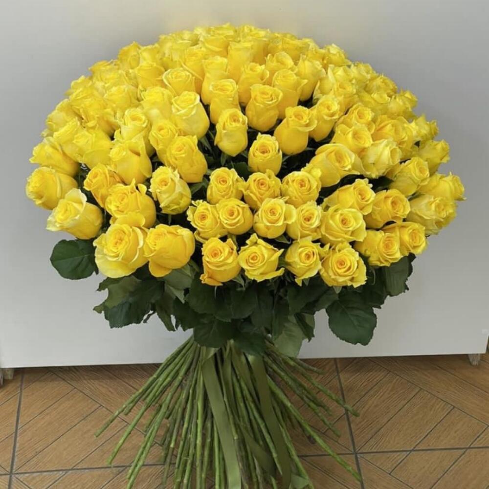 желтые розы – 51 шт. Атласная лента – 1 шт.