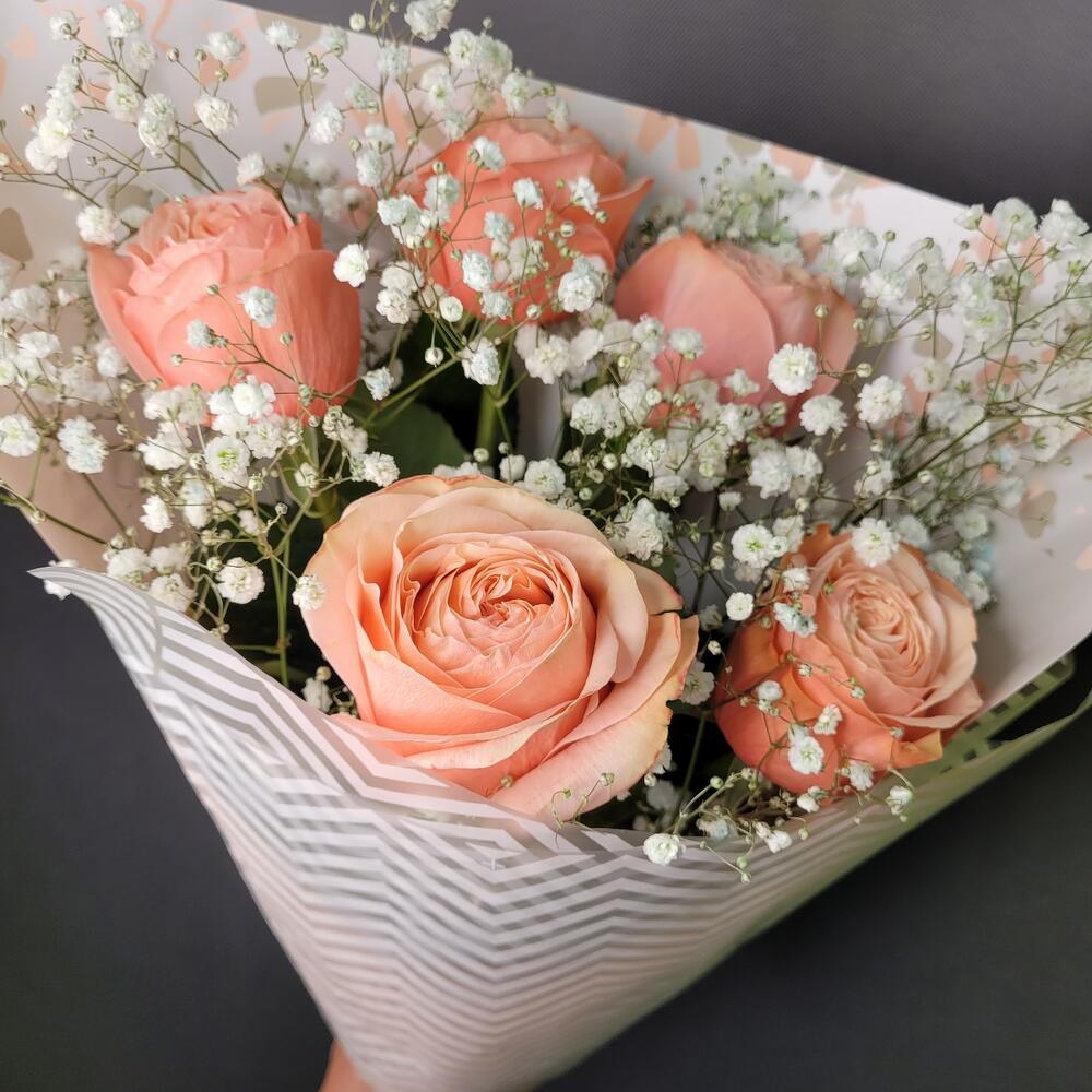 Роза Эквадор – 5 шт.Гипсофила – 2 шт.Упаковка дизайнерская – 1 шт.Лента атласная – 1 шт.