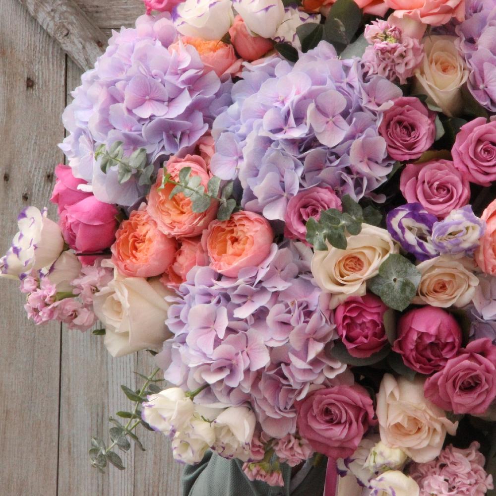 Роскошный букет из пионовидных роз, гортензий, маттиолы, лизиантуса и эвкалипта.Стильное цветочное решение длялюбого случая.Ширина букета около 80 сантиметров, высота букета около 60 сантиметров.
