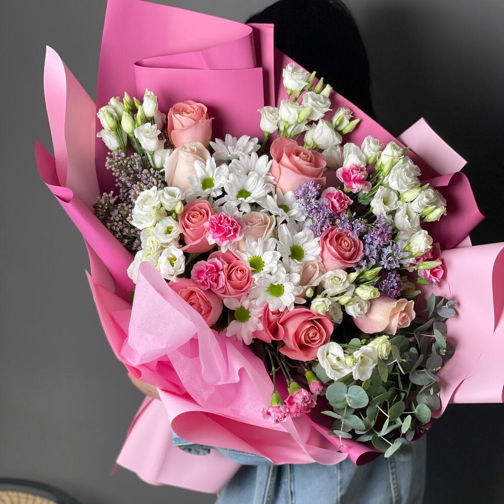 Гвоздики, Лизиантусы, Розы, Тюльпаны