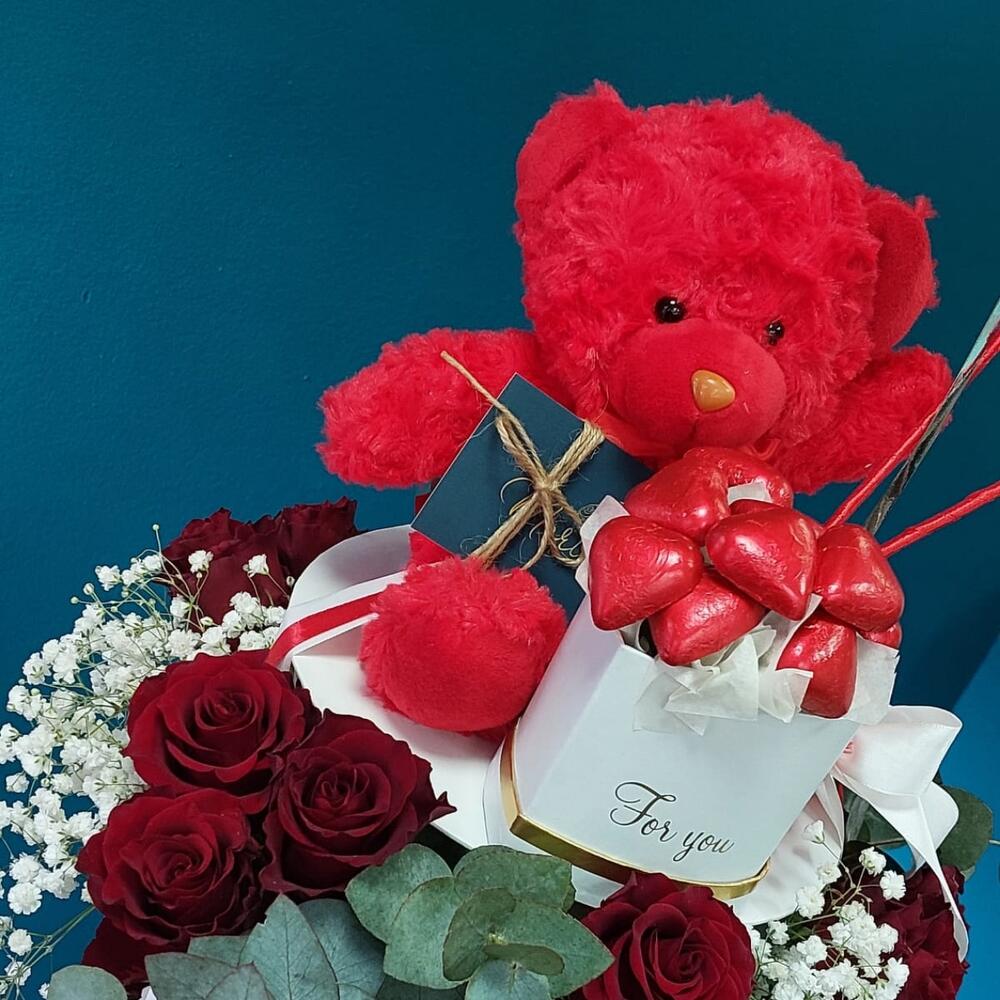 Роза – 11 шт. Гипсофила – 2 шт. Эвкалипт – 1 шт. Медведь плюшевый – 1 шт. серца серца – 1 шт. Коробка шляпная – 1 шт.