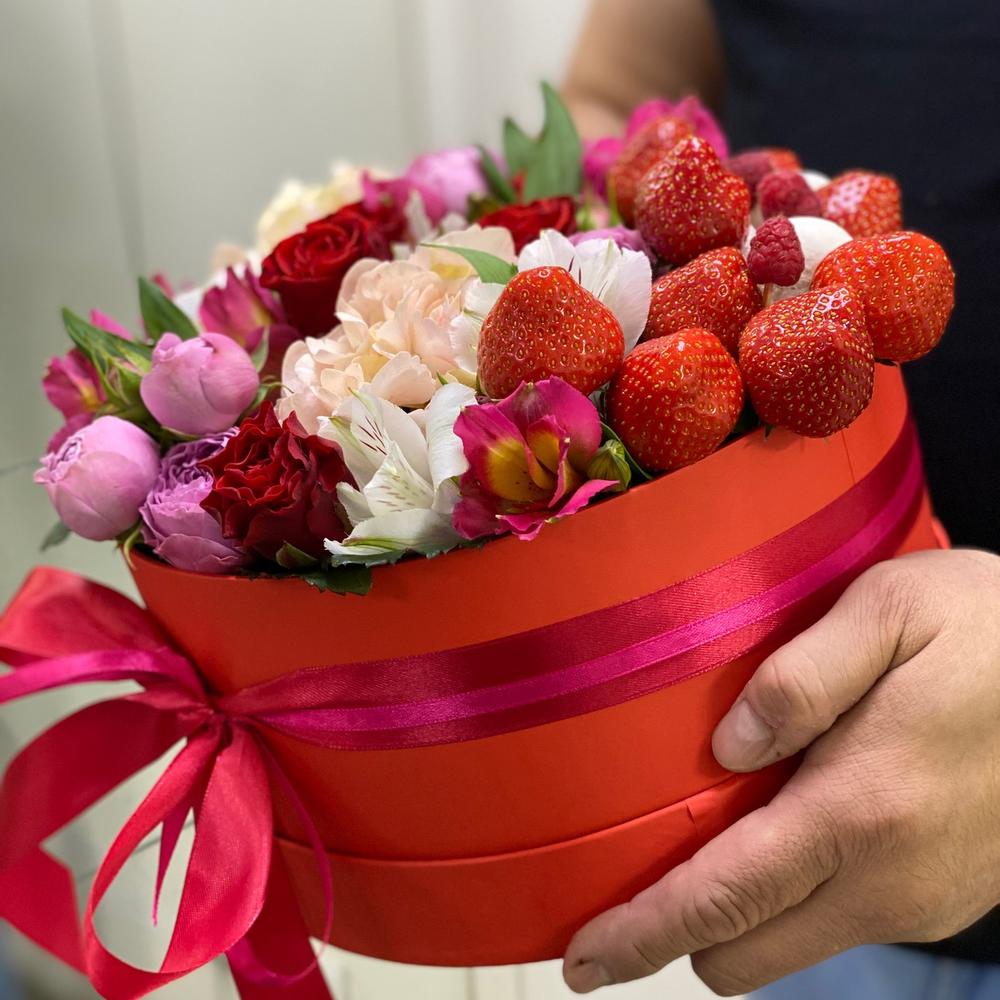 Шикарная композиция из любимых цветов с ароматной клубникой и вкусными пирожными!Смотрится эффектно! ❤️❤️❤️