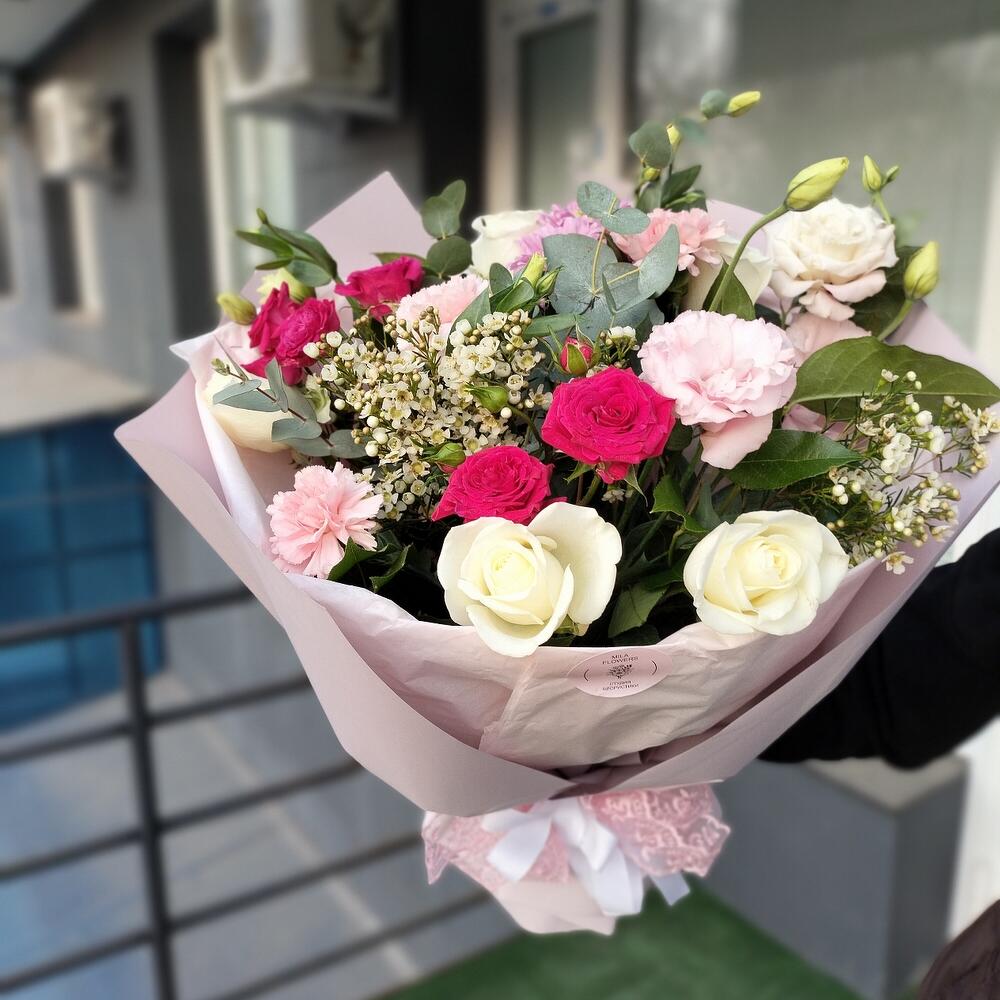 Гвоздики, Кустовые розы, Лизиантусы, Пионовидные розы, Розы